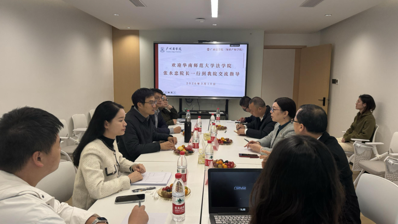 3月10日下午,华南师范大学法学院院长张永忠、副教授王影航来访我院交流知识产权学科建设。我院党总支书记陈秀图、副院长于明清、院长助理兰德忠、知识产权系主任袁木玲及其他教师共同参与本次座谈。